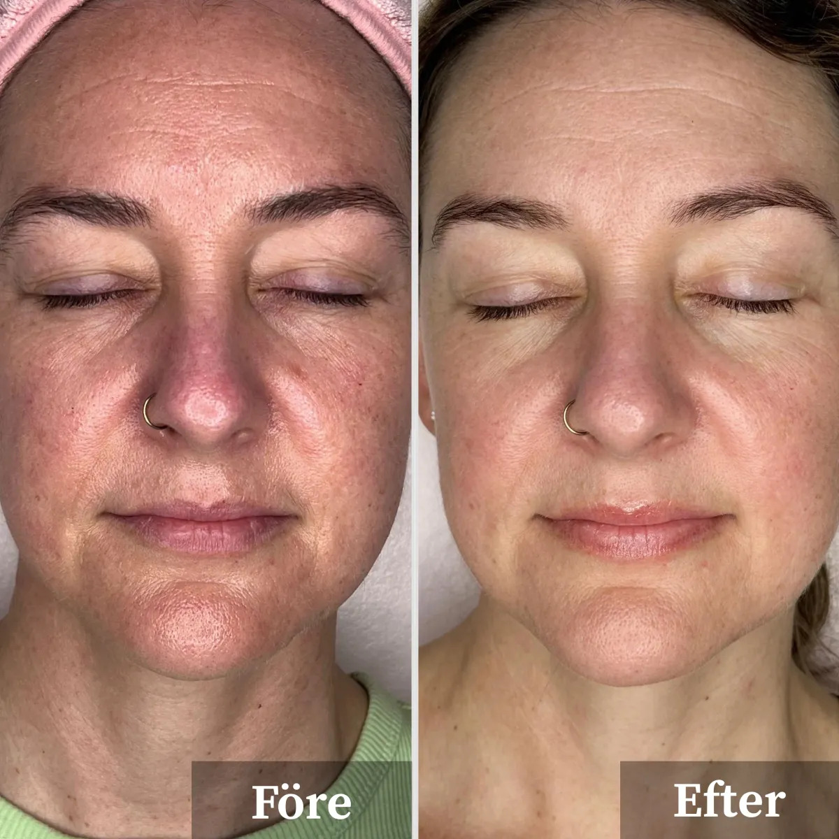 Efter behandlingen känns huden mer återfuktad, strålande och revitaliserad – med resultat som fortsätter att förbättras vid regelbundna behandlingar.
